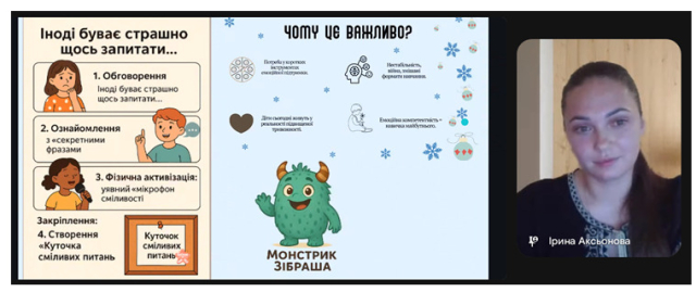 Ірина Аксьонова, практична психологиня Нікольської гімназії «Софія» із загальноосвітньою школою І ступеня № 2 Нікольської селищної ради Донецької області, присвятила свій інтерактивний виступ темі «Коучинг емоційної компетентності учнів початкової школи», запропонувала учасникам авторський практичний інструментарій, зазначивши, що емоційна компетентність – це навичка майбутнього.