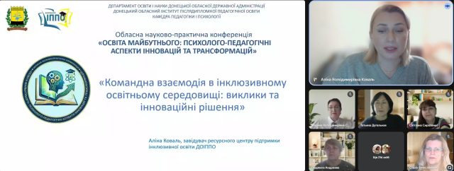 Пленарне засідання відкрила доповідь Аліни Коваль, завідувачка Ресурсного центру підтримки інклюзивної освіти Донецького ОблІППО, «Командна взаємодія в інклюзивному освітньому середовищі: виклики та інноваційні рішення». Вона підкреслила актуальність теми, окреслила основні виклики командної роботи та представила інноваційні підходи до її організації, зазначивши, що командна взаємодія є філософією сучасної освіти.