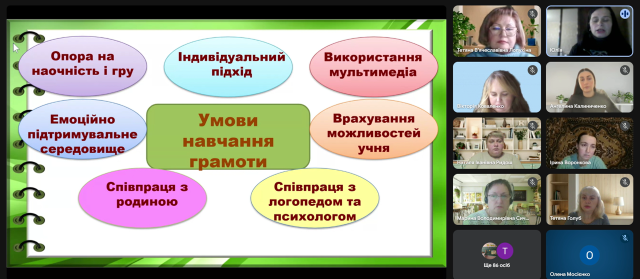 Учителька-логопедка Парасковіївської СШ № 40 Донецької обласної ради Руслана Артеменко увагу учасників зосередила на використанні текстоцентричної технології, яка дає можливість поєднувати розвиток мовленнєвих навичок із формуванням національної самосвідомості учнів з ООП.