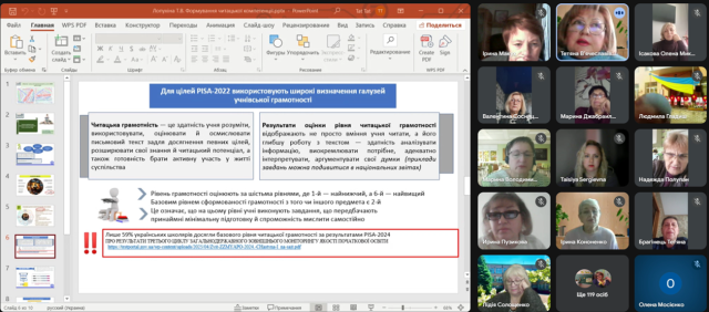Модератором заходу виступила Тетяна Лопухіна, методистка відділу психосоціального, фізичного здоров’я, розвитку особистості та освітньої безбар’єрності, кандидатка педагогічних наук, доцентка кафедри педагогіки і психології Донецького ОблІППО. Вона ознайомила учасників із проблемами оцінювання та читацької грамотності учнів, висвітлених у рамкових документах міжнародного дослідження PISA, та представила аналітику національного й міжнародного звітів за результатами PISA–2024. Означені аспекти потребують особливої уваги педагогів, адже їх урахування сприятиме ефективній адаптації практик навчання читання та посиленню читацької спроможності учнів, що є надзвичайно важливим для подолання освітніх втрат і розривів.