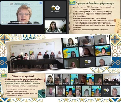 Ураховуючи сучасну домінантну позицію англійської мови в науковому світі – lingua franca науки, дискусія торкнулася питання доцільності перекладу фахової літератури та наукових текстів, а також обговорення проблеми «Чи не стане опрацювання текстів мовою оригіналу загрозою втрати національної суб’єктності?». Відповіді на ці запитання та обґрунтування думки про важливість використання національної наукової термінології як одного з ключових чинників збереження ідентичності в освітньому та науковому просторі, учасники панельної дискусії почули у виступі Лариси Кошалковської, методистки відділу природничих дисциплін та STEM-освіти кафедри природничо-математичних дисциплін та методики їх викладання Донецького ОблІППО.