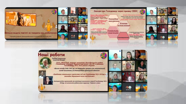 Оксана Дейнекіна, заступниця директора з ВР, та Любов Гаврилова, учителька історії Новогродівського опорного закладу загальної середньої освіти № 7 Новогродівської міської ради Донецької області на прикладі заходів з увічнення пам’яті жертв Голодомору-геноциду продемонстрували їхню інтеграцію в навчальні предмети, а також презентували шкільну модель пам’яті – як говорити про незбагненне.