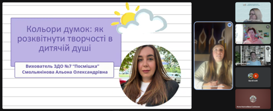 Тему «Кольори думок: як розквітнути творчості в дитячій душі» розкрила Альона Смольянінова, вихователька закладу дошкільної освіти № 7 «Посмішка» Мирноградської міської ради Покровського району Донецької області.