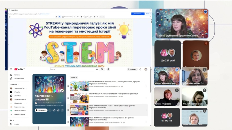 Досвід реалізації STREAM-підходу при опануванні предметів природничого циклу представила Олена Трубчаніна, учитель хімії Ліцею № 2 Покровської міської ради Донецької області, яка ознайомила учасників зі структурою та змістом власного YouTube‑каналу й презентувала методичні підходи, доцільні для вивчення предметів природничої галузі. Такі підходи забезпечують навчання через діяльність, «перетворення» уроків хімії на інженерні та мистецькі історії, а також підвищують зацікавленість учнів освітнім процесом, залучаючи їх до «рукотворної науки», яка передбачає моделювання, конструювання та випробування на практиці.