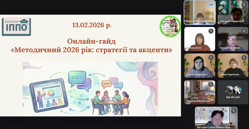 13 лютого 2026 року для вчителів мистецьких дисциплін Донеччини в дистанційному форматі відділом мовно-літературної та мистецької освіти Донецького ОблІППО проведено методичний онлайн-гайд «Методичний 2026 рік: стратегії та акценти», який об’єднав понад 100 освітян області.