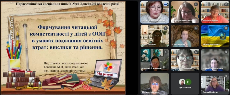 Марина Кабанець, учитель-дефектолог Парасковіївської спеціальної школи № 40 Донецької обласної ради, представила системний огляд стратегій подолання освітніх втрат у дітей з ООП через упровадження адаптивних методик формування читацької компетентності, що дають змогу ефективно компенсувати прогалини в знаннях і забезпечити сталість навчального прогресу в кризових умовах.
