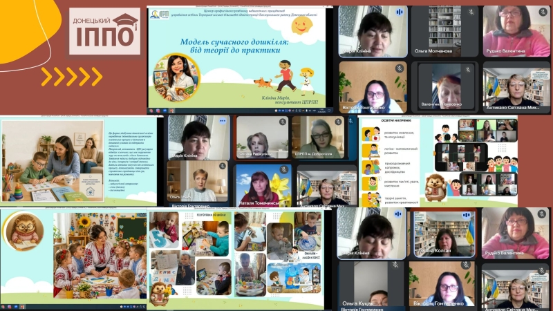 Марія Клініна, консультант ЦПРПП міського управління освіти ВЦА м. Торецьк, презентувала модель системної методичної роботи з педагогами, представила практичний досвід організації дошкільної освіти в онлайн-форматі й акцентувала увагу на ефективних формах взаємодії з дітьми та батьками, а також окреслила перспективи розвитку дошкілля в умовах сучасних викликів і трансформацій.