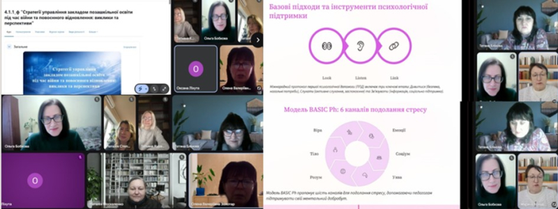 Підвищення кваліфікації спрямовувалося на вдосконалення управлінської та методичної компетентності керівників і методистів закладів позашкільної освіти щодо стратегічного управління закладом в умовах війни та повоєнного відновлення на засадах безпеки, стійкості, інноваційності й партнерства. Учасники отримали практичні знання щодо нормативно-правових аспектів діяльності закладів освіти в умовах воєнного стану та відбудови; особливостей управління закладом освіти в кризових умовах; стратегій повоєнного відновлення закладу; удосконалили вміння здійснювати стратегічний аналіз та реалізовувати проєктну діяльність.