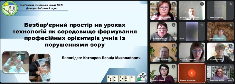 Леонід Котляров, учитель технологій і трудового навчання Слов’янської спеціальної школи № 23 Донецької обласної ради, представив досвід створення адаптивного безбар’єрного середовища на уроках технологій, що є основою для успішного професійного самовизначення учнів із порушеннями зору.