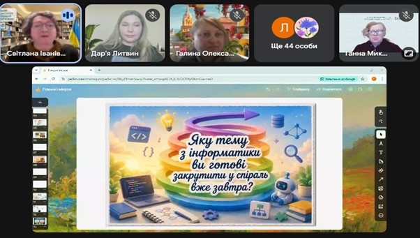 29 квітня 2026 року відбувся вебінар «Спіральний підхід у навчанні інформатики», який об’єднав понад 60 педагогів області, зацікавлених у впровадженні сучасних методичних підходів і підвищенні ефективності освітнього процесу.