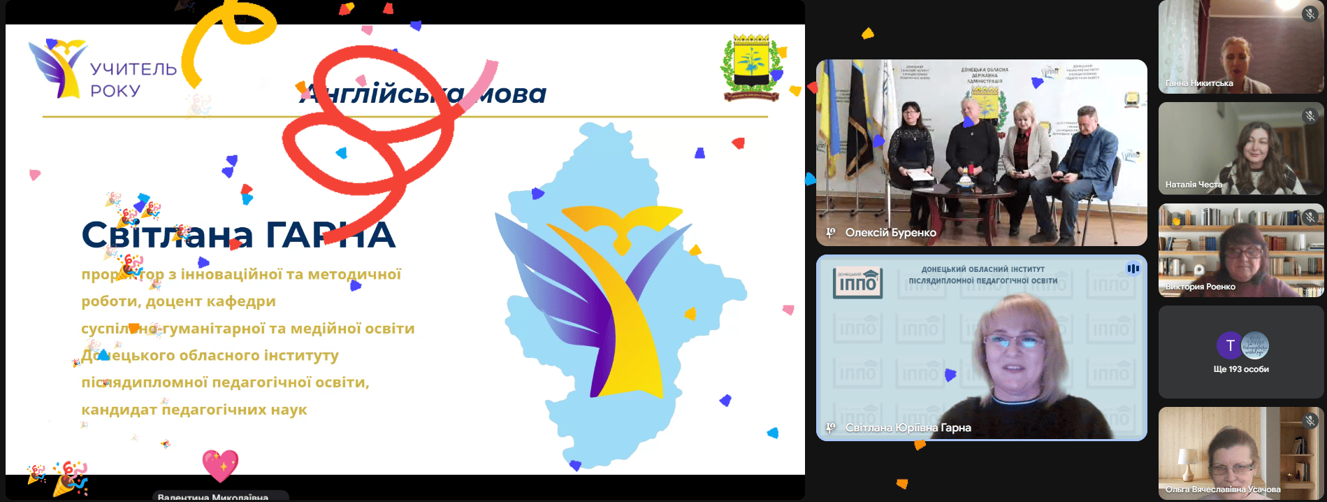 Урочиста частина заходу супроводжувалася музичними вітаннями освітянській спільноті від Мілани Мороз, солістки вокального ансамблю «Надія» Донецького обласного Палацу молоді «Юність» (керівник – Ольга Мороз); гуртка естрадної пісні «Сузір’я» (керівники – Людмила й Олександр Юрченки); зразкового художнього колективу ансамблю танцю «Усмішка» (керівники – Олена та Ігор Голіки); Народного художнього колективу вокальна студія «Heartbeat» (керівник – Геннадій Петренко) Донецького обласного палацу дитячої та юнацької творчості.