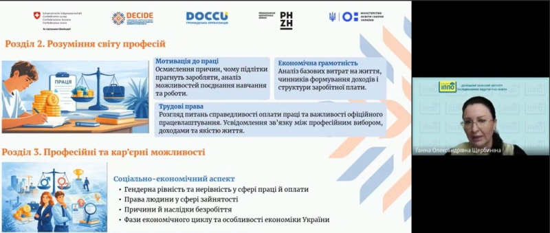09 квітня 2026 року в межах швейцарсько-українського проєкту DECIDE «Децентралізація для розвитку демократичної освіти» завершилося навчання п’яти груп педагогічних працівників ЗЗСО за освітньою програмою «Карʼєрний супровід дітей та підлітків в закладах освіти (за матеріалами курсу «Професії»)».