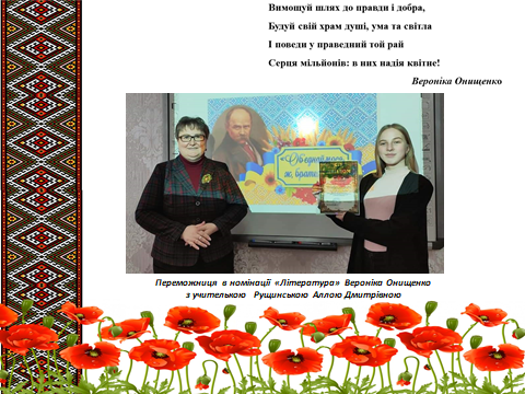 У номінації «Література» раді перемозі Онищенко Вероніки Антонівни, учениці 11 класу Краматорської загальноосвітньої школи І-ІІІ ступенів № 10 з профільним навчанням Краматорської міської ради Донецької області (збірка поезій «Шлях до серця України!»); учителька-наставниця Рущинська Алла Дмитрівна.