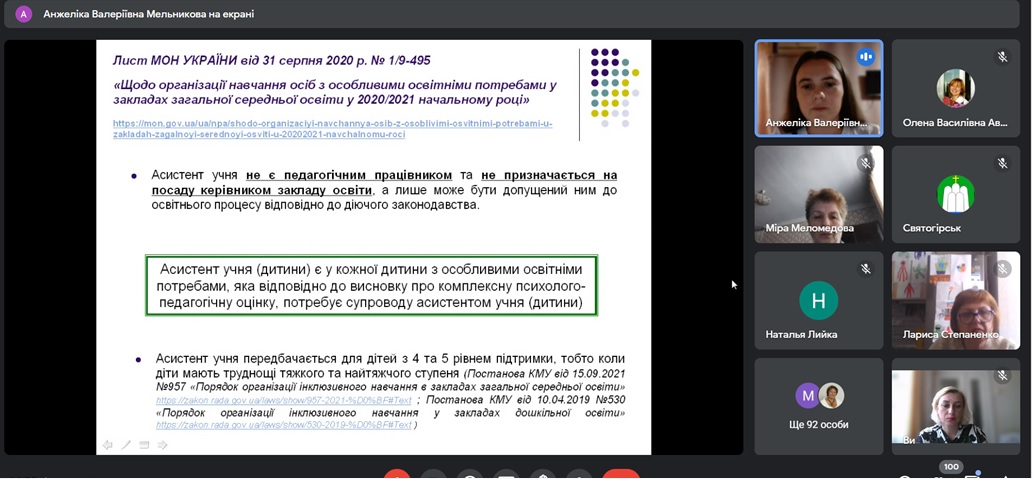 Під час зустрічі розглянуто нормативно-правовий аспект забезпечення інклюзивного навчання в закладах освіти, розкрито особливості роботи асистента вчителя/вихователя в умовах інклюзивного класу/групи та асистента учня (дитини).