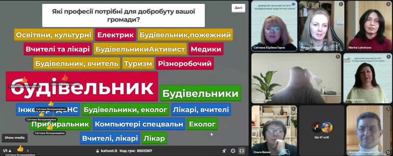 Практичний блок заходу організовано в інтерактивному форматі. Учасники – як учні, так і дорослі – брали участь в онлайн-опитуваннях, спільно обговорювали чинники, що впливають на професійний вибір, а також осмислювали значення профорієнтаційної підтримки в рішенні пов’язати своє майбутнє з рідною громадою. Під час мініворкшопів робота відбувалася в групах: учасники аналізували сильні сторони й виклики різних професій, ділилися власним досвідом та міркували над освітніми й професійними траєкторіями, необхідними для успішної самореалізації.