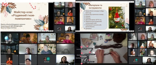 Онлайн-майстерку з виготовлення «Різдвяного гнома-помпончика» провела Ельвіра Калугіна, учителька технологій / трудового навчання Краматорського навчально-виховного комплексу «Загальноосвітня школа І–ІІІ ступенів №6 – дошкільний навчальний заклад Краматорської міської ради». Учасникам заходу, зокрема учням, вихованцям шкільного гуртка з технологій «Творча майстерня», презентовано покроковий процес створення Різдвяного гнома з доступних для всіх матеріалів.