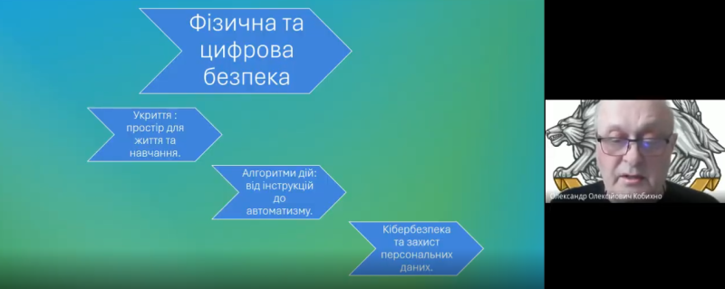 В. о. завідувача кафедри управління та адміністрування, завідувач відділу закладів дошкільної, загальної середньої та професійної освіти Олександр Кобихно звернув увагу на безпековий вектор розвитку закладу освіти, зокрема кібербезпеку та захист персональних даних.