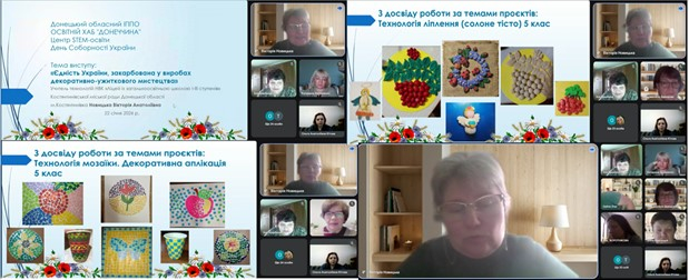 Визнаючи освітньо-виховний потенціал технологічної освітньої галузі, Вікторія Новицька, учителька технологій НВК «Ліцей із загальноосвітньою школою І–ІІІ ступенів» Костянтинівської міської ради Донецької області, розкрила можливості технологічної галузі в ознайомленні учнів з національною культурою, традиціями, історією та застосуванням цих надбань в умовах сьогодення. Присутніх було ознайомлено з такими традиційними технологіями, як ліплення, ткацтво, мозаїка, декоративна аплікація, плетіння, вишивання, виготовлення іграшок, а також надано методичні поради щодо їх опанування учнями різних вікових категорій в умовах дистанційного навчання.