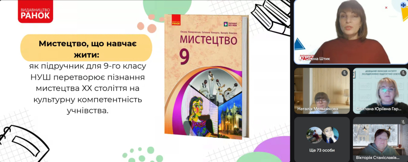 Методичний онлайн-гайд розпочався з презентації підручника з мистецтва для 9-го класу НУШ. Олена Штик, методистка з мистецтва видавництва «Ранок», продемонстровала, як зміст та методичний інструментарій підручника оживлюють вивчення модернізму й авангарду, розвивають критичне мислення та емоційну чутливість учнівства; окреслила практичні підходи для роботи з підлітками й презентувала компетентнісні завдання, які допомагають усвідомлювати мистецтво в сучасному контексті.