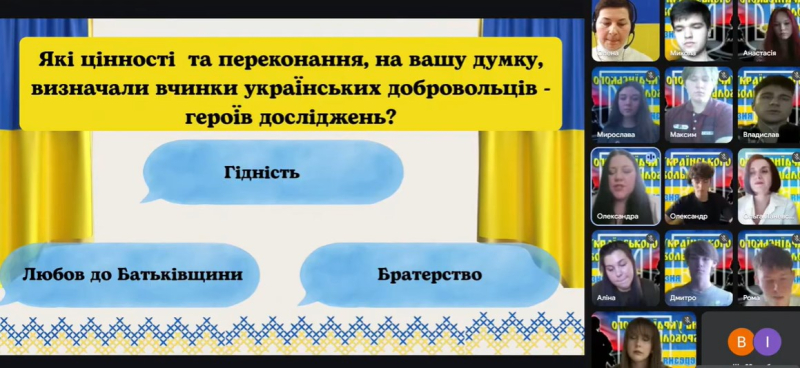 Здобувачі освіти поділилися думками про цінності та переконання, які визначали вчинки українських добровольців – героїв досліджень, висловили асоціації до терміну «доброволець».